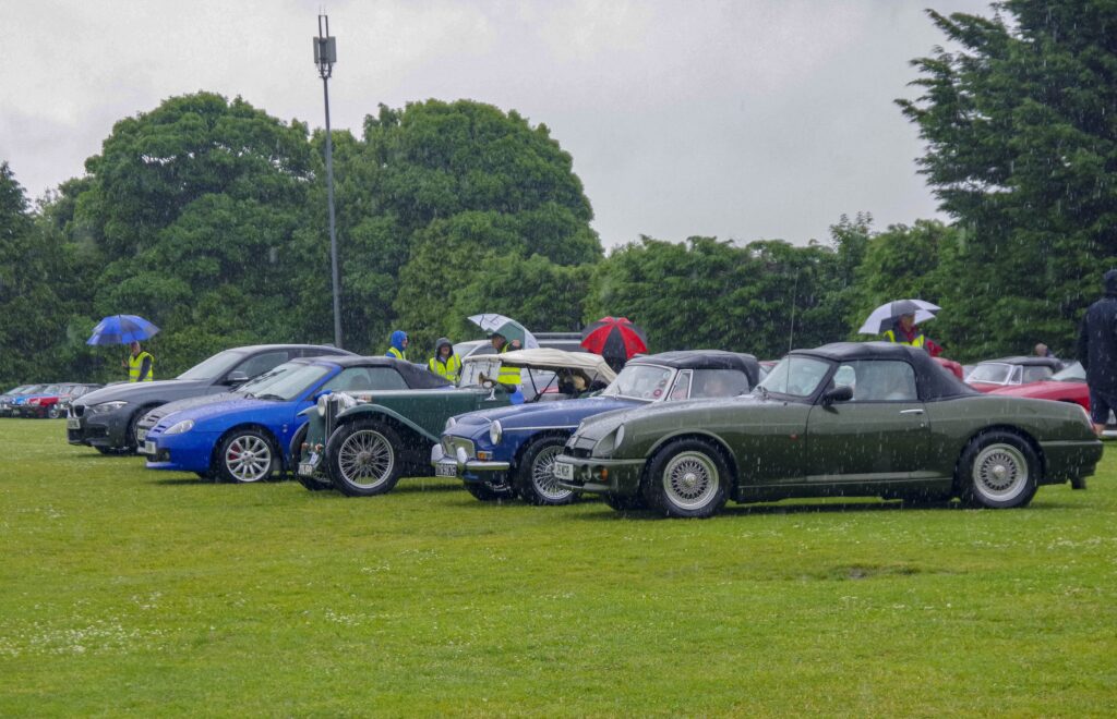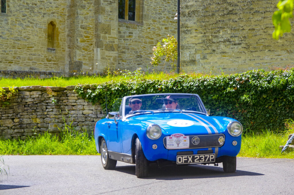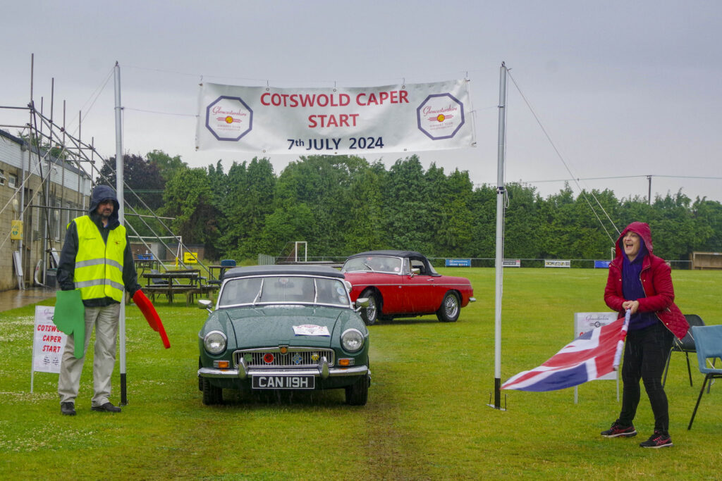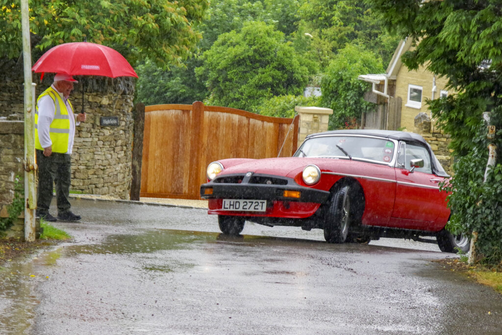 Having avoided rain for the last few years, unfortunately this year the weather lived up to the forecast, which meant that all of the cars left the start point in Chalford near Stroud in pouring rain. Luckily the rain had gone by the halfway stop, allowing participants to eat their picnics in the sun. The afternoon was kinder, so people drove top down and fully appreciate the lovely Cotswold countryside. The rain did return later in the afternoon although by then most had returned to the sports club for tea, cakes and a glass of beer.